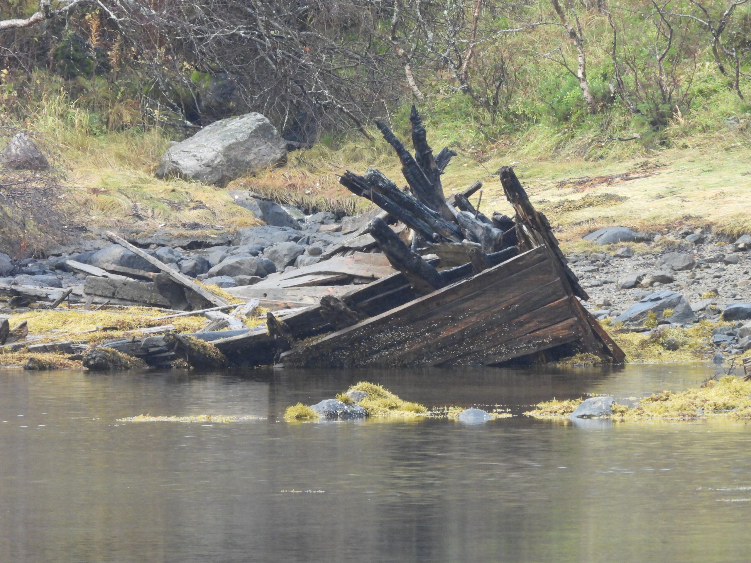 Kurz nach dem Schild machten wir noch einen Abstecher. Auf der Karte war ein Wrack eingezeichnet. Wir fanden es – oder zumindest Teile davon. Es handelte sich um ein altes Holzschiff, größtenteils verfallen. Nur noch der Bug ragte aus dem Wasser, daneben lagen vereinzelt Planken, Moos, Algen.
